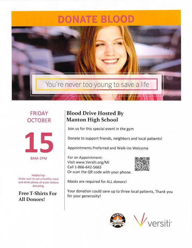 The Manton High School is hosting a Blood Drive on October 15, 2021 at the High School Gym from 8-2. Please see the flyer for more info